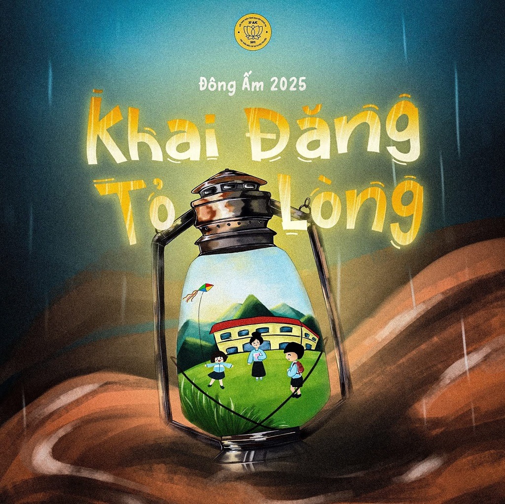 Hình ảnh chiếc đèn bấc ôm trọn ngôi trường nhỏ giữa khung cảnh tối lạnh được lựa chọn làm biểu tượng xuyên suốt của Đông Ấm 2025. Ngọn đèn không chỉ tượng trưng cho ánh sáng mà còn là sự đồng hành, che chở và niềm tin mà Ban Tổ chức muốn gửi tới các em học sinh và thầy cô. Khi thiên tai qua đi, mỗi sự sẻ chia chính là một nguồn sáng góp phần thắp lên hy vọng về một tương lai rực rỡ.